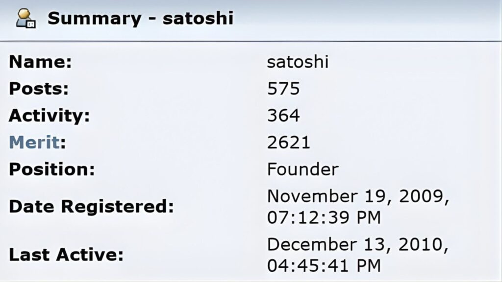 The image circulating today appears simple. It shows Satoshi’s registration date of November 19, 2009.