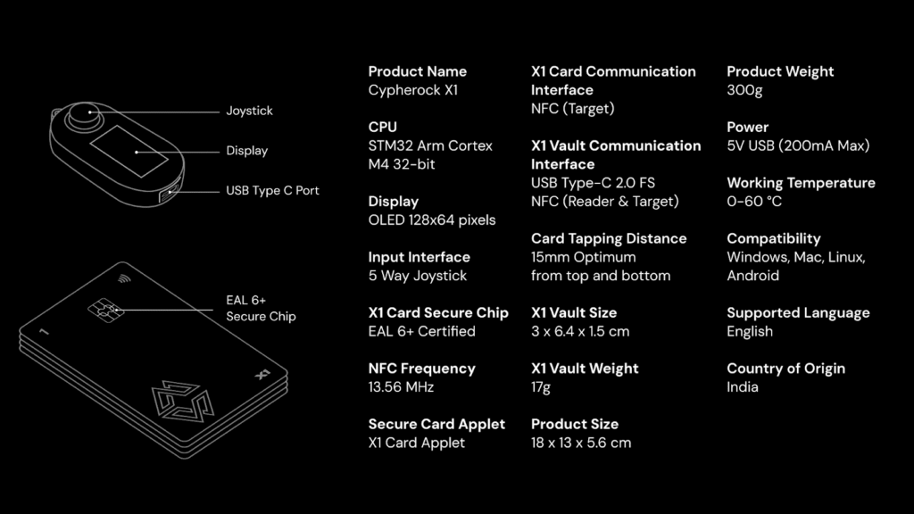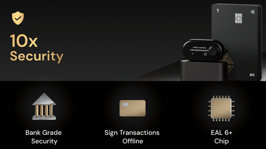 The X1 cards feature bank-grade encryption and EAL6+ certified chips. The X1 vault allows offline transaction signing with a joystick and display.