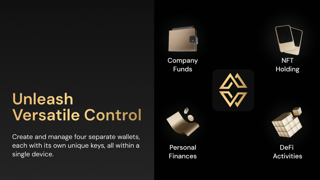With Cypherock X1, you can create and manage four separate wallets, each with its own unique keys, all within a single product. This flexibility enables you to designate one wallet for company funds, another for personal finances, a third for DeFi activities, and a fourth for NFT holdings, providing versatile control over your various assets.