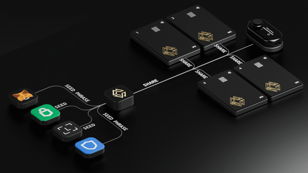 Cypherock X1 employs the ‘Shamir Secret Sharing’ algorithm, splitting private keys into 5 parts cryptographically, stored on tamper-proof components – 4 X1 cards and 1 vault device.